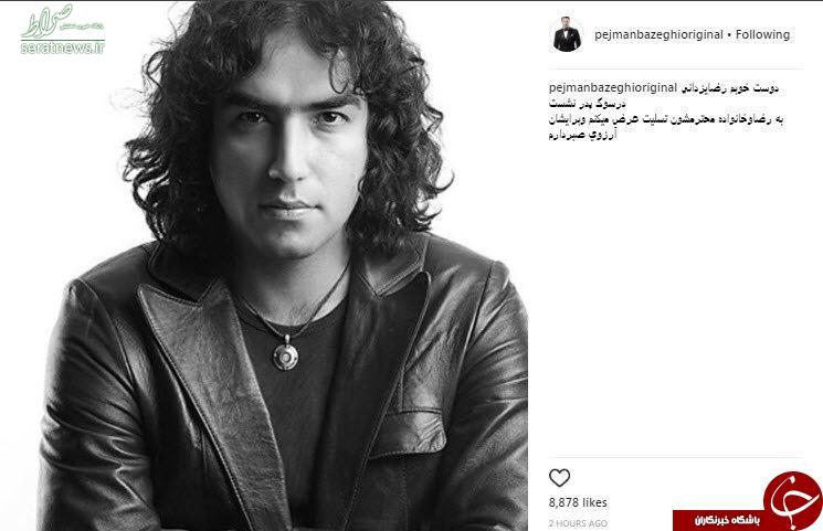 رضا یزدانی خواننده جوان موسیقی کشورمان در غم از دست دادن پدرش به سوگ نشست به همین منظور  پژمان بازغی با انتشار پستی در صفحه اینستاگرامش درگذشت پدر این خواننده کشورمان را تسلیت گفت. پژمان بازغی در صفحه اینستاگرام خود نوشت: "دوست خوبم رضا یزدانی درسوگ پدر نشست. به رضا و خانواده محترمشون تسلیت عرض میکنم و برایشان آرزوی صبر دارم."