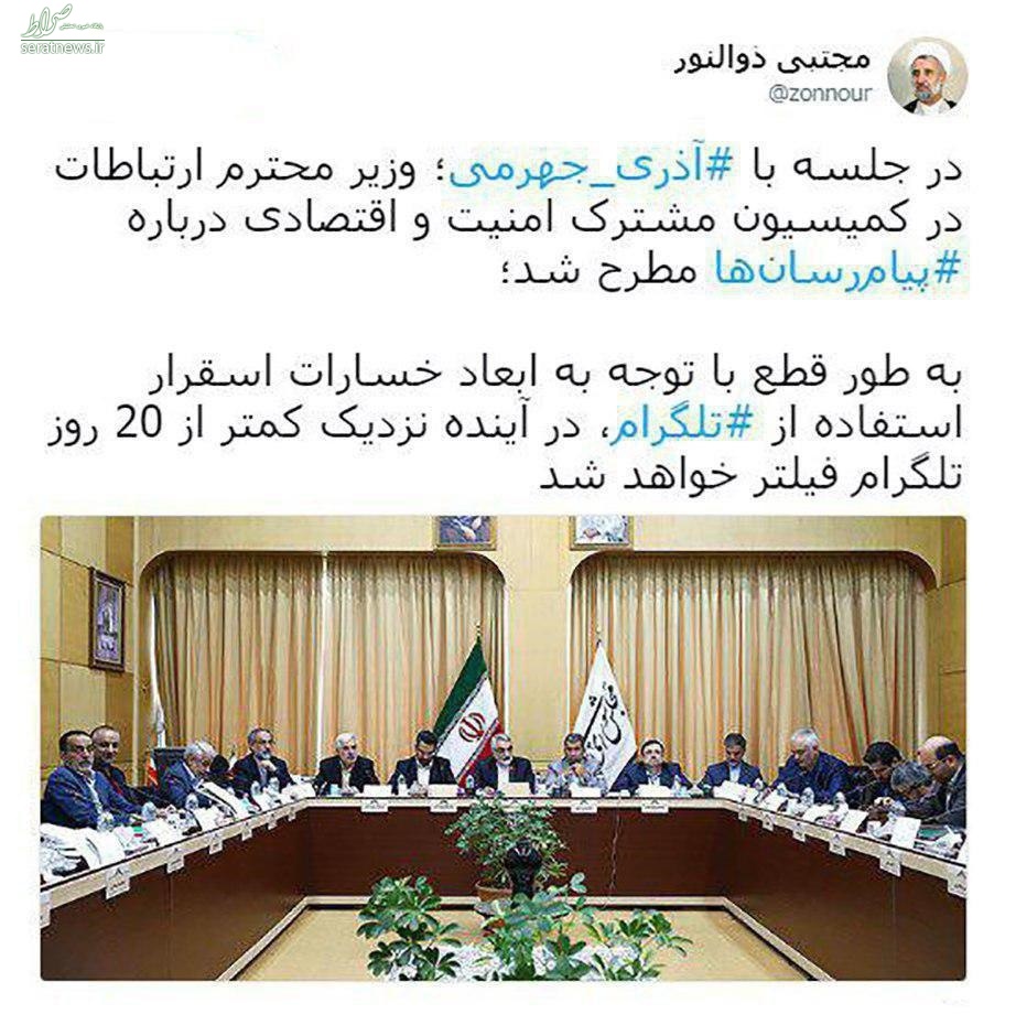 مجتبی ذالنور نماینده مردم قم در توئیتی به جلسه کمیسیون امنیت با وزیر ارتباطات اشاره کرد و با هشتگ آذری جهرمی و پیام رسان ها و تلگرام نوشت: در جلسه ای با آذری جهرمی؛ وزیر محترم ارتباطات در کمیسیون مشترک امنین و اقتصادی درباره #پیامرسانها مطرح شد؛ به طور قطع با توجه به ابعاد خسارات استقرار استفاده از #تلگرام، در آینده نزدیک کمتر از 20 روز تلگرام فیلتر خواهد شد.