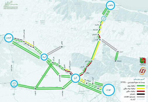 به گزارش میزان بر اساس اعلام سازمان راهداری و حمل و نقل جادهای مسیر چالوس از ابتدا جاده تا سد کرج با راهبندان و از سد کرج تا مرزن آباد با ترافیک نیمه سنگین همراه است.