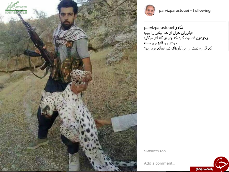 متاسفانه اخیرا شاهد اخبار بسیاری در رابطه با شکار غیرقانونی و به اسارت درآوردن حیوانات هستیم. بر اساس محتوای این اخبار، برخی از شکارچیان، حیوانات را مورد آزار و اذیت خود قرار می دهند و با آنها عکس سلفی می اندازند. در همین زمینه پرویز پرستویی بازیگر پرآوازه سینما و تلویزیون ایران، پست انتقادآمیزی را در مورد عکس سلفی که یکی از این شکارچیان غیرقانونی در فضای مجازی به اشتراک گذاشته، به اشتراک گذاشت و به عمل غی انسانی او اعتراض کرد. پرستویی نوشت: "فیگور این جوان از خدا بی خبر را ببینید و خودتون قضاوت کنید ،که چی تو کله اش میگذره .خودش رو فاتح چی میبینه کی قراره دست از این کارهای غیرانسانی برداریم؟"