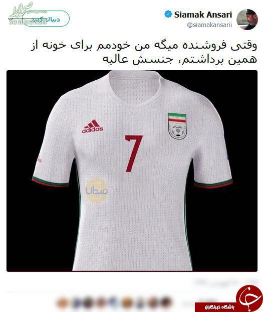 روز گذشته عکسی از لباسی منتسب به تیم ملی ایران منتشر شد. پس از آن در فضای مجازی و توسط کانال‌های مختلف اعلام شد این همان لباس تیم ملی در جام جهانی است و به دلیل فرصت کمی که وجود داشته به شکلی ساده طراحی شده است؛ لباسی که برخلاف تصورات طرح زیبایی نداشت و همانطور که انتظار می رفت تصویری از یوز ایرانی هم روی آن نبود. به همین منظور سیامک انصاری بازیگر سینما و تلویزیون با انتشار پستی در صفحه توییتر خود مطلبی درباره پیراهن تیم ملی که این روز‌ها سوژه خبری رسانه‌ها شده است منتشر کرد. سیامک انصاری در صفحه توییتر خود نوشت: "وقتی فروشنده میگه من خودمم برای خونه از همین برداشتم، جنسش عالیه"
