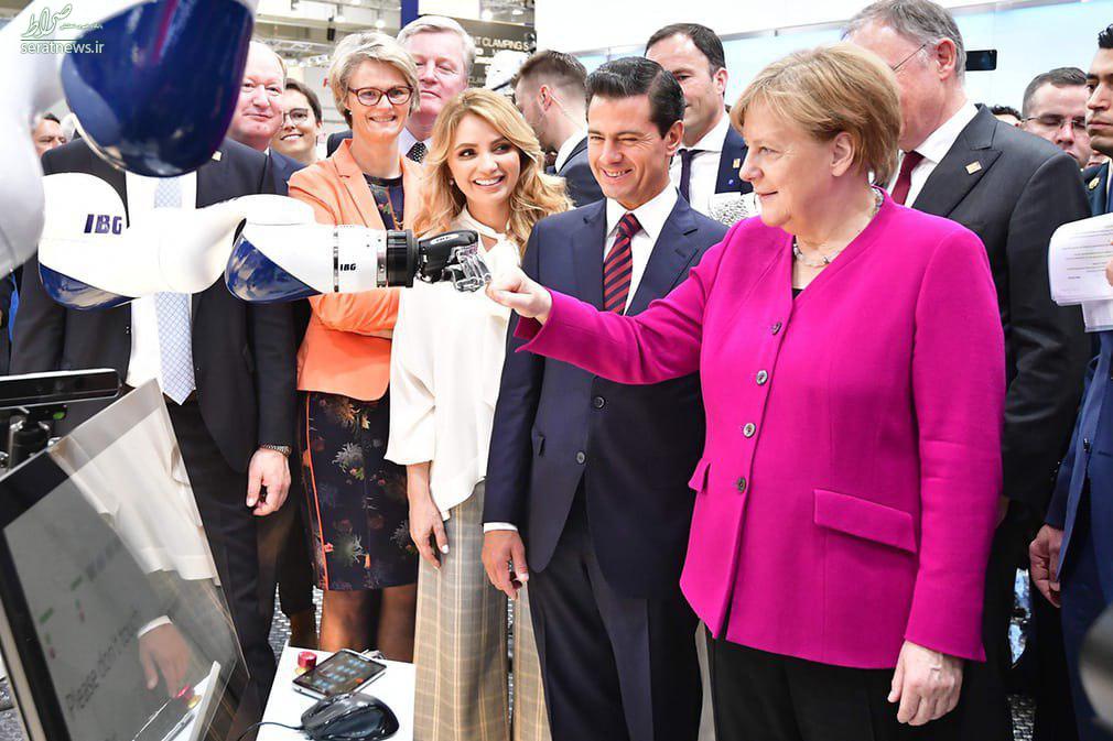"خوشوبش" صدر اعظم آلمان با یک روبات در نمایشگاه سالانه "هانوفر" آلمان. افراد کنار آنگلا مرکل رییس جمهوری و بانوی اول مکزیک هستند.