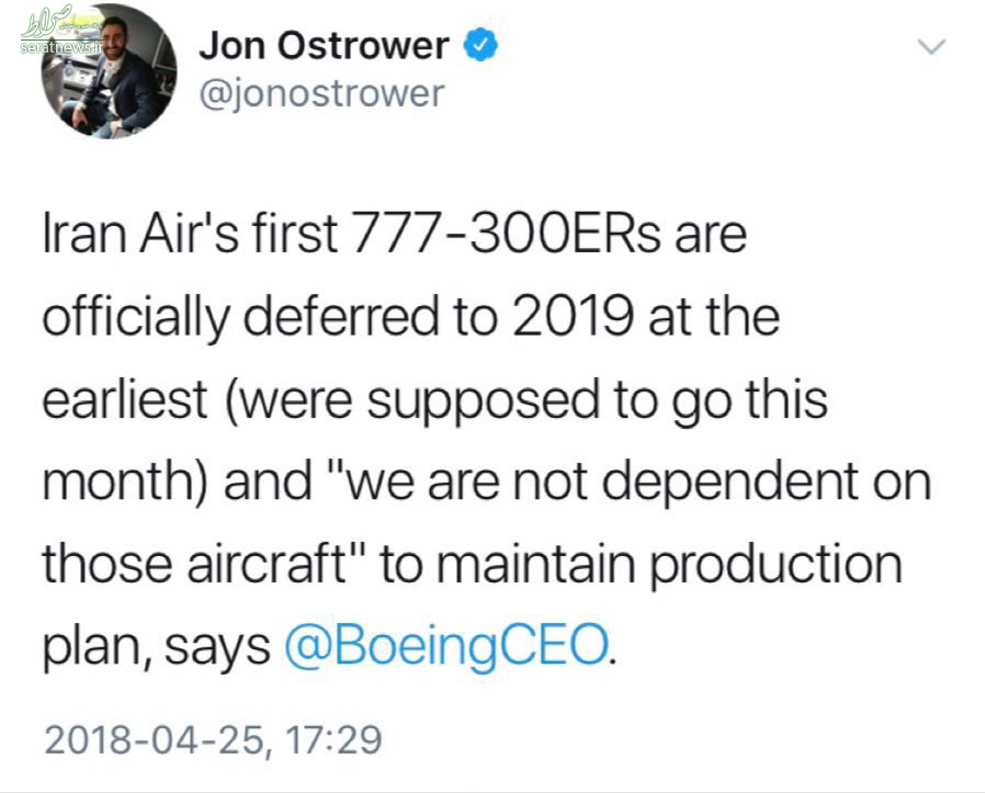 یک روزنامه نگار امریکایی به نقل از مدیرعامل بوئینگ از جابجایی تاریخ تحویل نخستین بوئینگ ۷۷۷ هما به سال ۲۰۱۹ میلادی خبرداد.