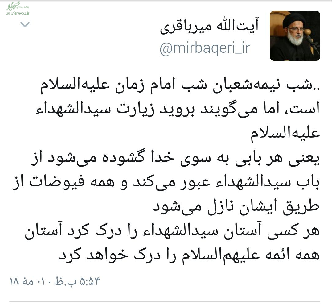 صفحه توییتر منتسب به آیت الله میرباقری درباره نیمه شعبان و زیارت امام حسین (ع) نوشت: