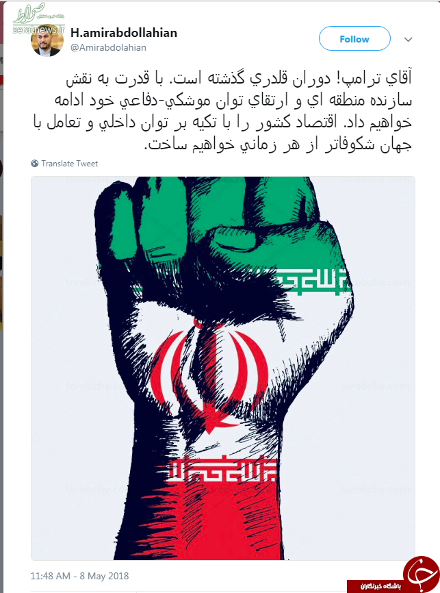 حسین امیر عبداللهیان با انتشار متنی در حساب کاربری توئیترش نسبت به تصمیم اخیر ترامپ واکنش نشان داد.  امیر عبداللهیان نوشت:"آقای ترامپ! دوران قلدری گذشته است. با قدرت به نقش سازنده منطقهای و ارتقای توان موشکی-دفاعی خود ادامه خواهیم داد. اقتصاد کشور را با تکیه بر توان داخلی و تعامل با جهان شکوفاتر از هر زمانی خواهیم ساخت."