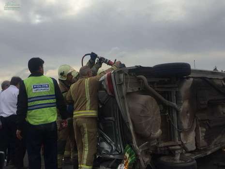 به گزارش مهر پرشیا به دلیل شدت برخورد از مسیر خود منحرف شد و پس از تصادف با گاردریل حاشیه اتوبان، واژگون شد و آتش گرفت.