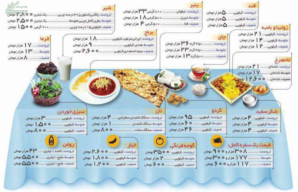 روزنامه همشهری گزارشی در خصوص خوراکی های سفره ماه رمضان تهیه کرده که در آن قیمت تمام شده یک وعده افطاری برای اقشار ثروتمند؛ متوسط و فقیر مشخص شده است.