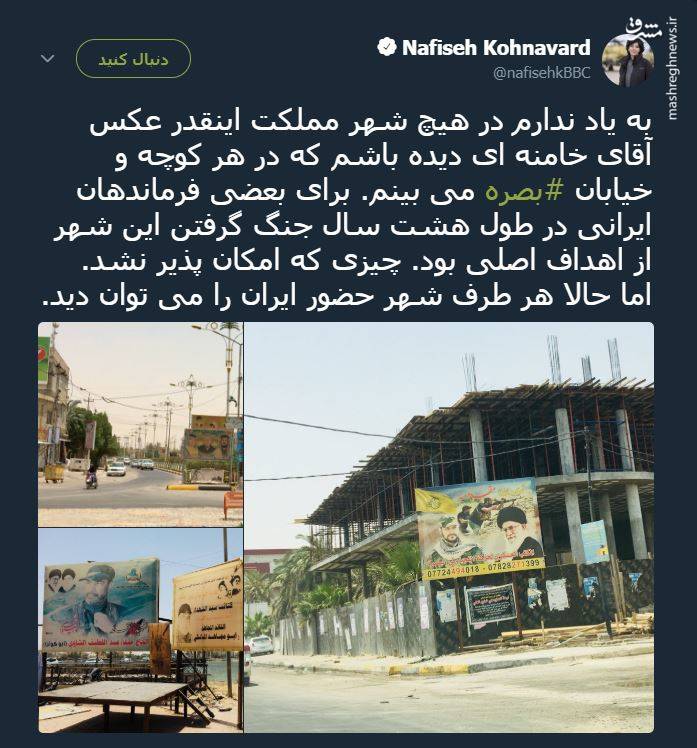 نفیسه کوهنورد خبرنگار زن بی بی سی در پست توئیتری خود با انتشار تصاویری از رهبر انقلاب در خیابان های بصره، نوشت:
