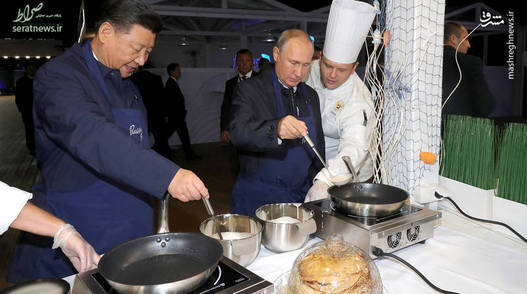 رئیس جمهور چین که به روسیه سفر کرده است در کنار پوتین به آشپزی پرداخت. آنها در تصویر زیر در حال پختن پنکیک هستند.