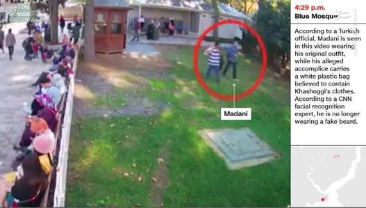 این شبکه تصاویر دوربین‌های مدار بسته از «مصطفی المدنی» یکی از اعضای تیم 15 نفره ترور اعزامی ریاض به استانبول ترکیه را منتشر کرده است، کسی که بعد از قتل خاشقجی به منظور گمراه کردن افراد درباره خروج او از کنسولگری، لباس‌های این روزنامه‌نگار را پوشیده و با گریم خود را شبیه به خاشقجی کرده بود.در بخشی از تصاویری که در اختیار این شبکه آمریکایی قرار داده شده، «مصطفی المدنی» چند ساعت بعد از قتل خاشقجی در اطراف مسجد سلطان احمد در استانبول دیده می‌شود.