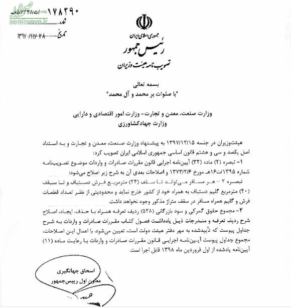به گزارش ایسنا مجموع حقوق گمرکی و سود بازرگانی ۵۲۸ ردیف تعرفه همراه با حذف، ایجاد، اصلاح شرح ردیف تعرفه و مندرجات فصول کتاب مقررات صادرات و واردات به شرح جداول پیوست که تأیید شده به مهر دفتر هیأت دولت است تعیین میشود.