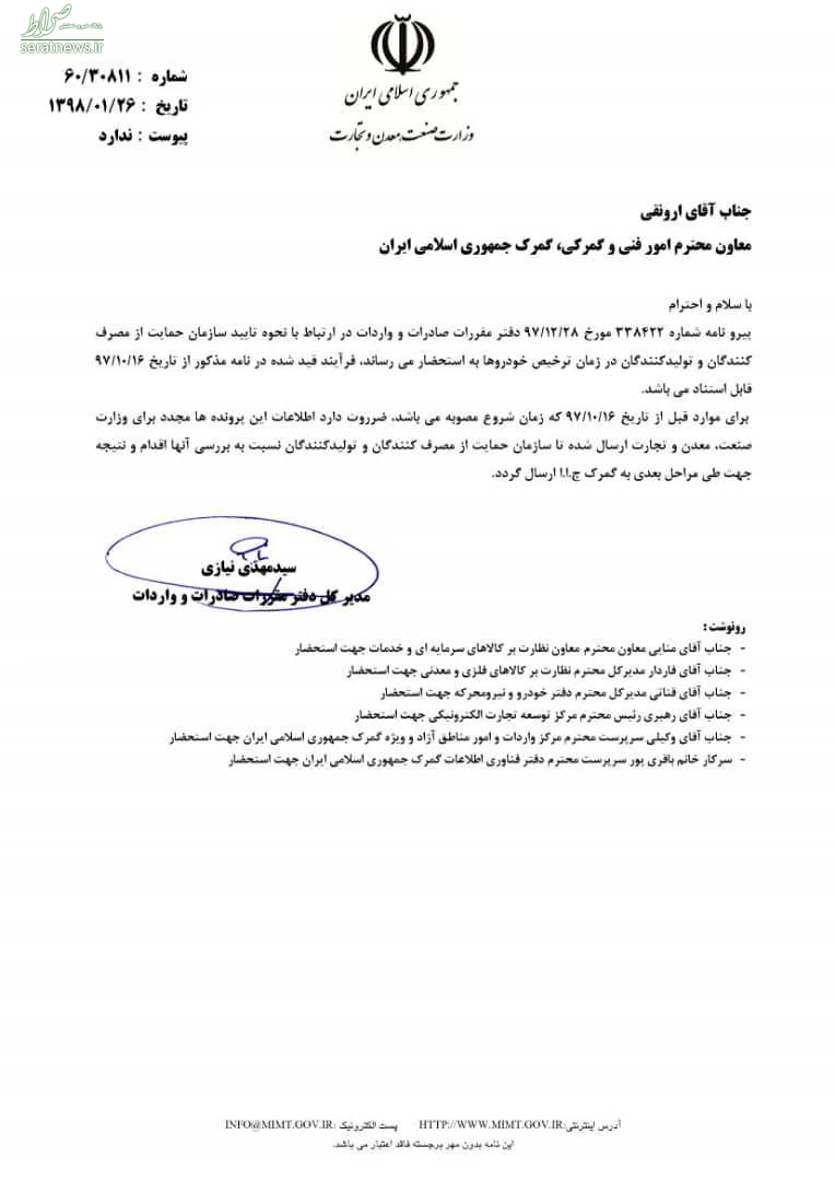 تصویر/ مکاتبات وزارت صنعت با گمرک در مورد ترخیص خودروها