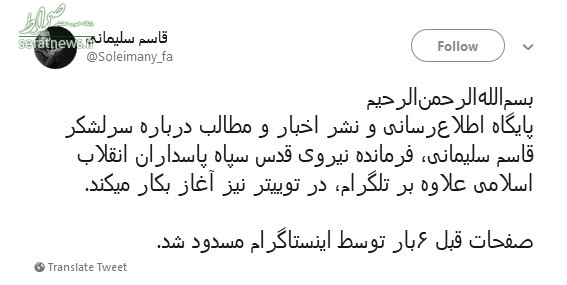 پایگاه اطلاعرسانی و نشر اخبار و مطالب درباره سرلشکر قاسم سلیمانی، فرمانده نیروی قدس سپاه پاسداران انقلاب اسلامی علاوه بر تلگرام، در توییتر نیز آغاز بکار میکند. صفحات قبل ۶بار توسط اینستاگرام مسدود شد.»