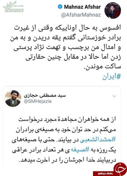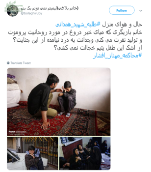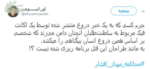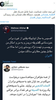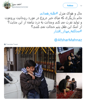 ماجرا از این قرار بود که چند روز پیش یک حساب جعلی در توییتر با تصویر یک روحانی مازندرانی فتوایی صادر و زنان را به نکاح با نیروهای حشدالشعبی که برای کمک به سیلزدگان در خوزستان بودند، تشویق میکرد؛ متأسفانه مهناز افشار این اکانت جعلی را جدی گرفت و در محکومیت آن توییتی منتشر کرد و به نوعی با بازنشر آن، شایعه پاگرفته در فضای مجازی را بیش از پیش قوت بخشید. آن طور که دوست قاتل طلبه همدانی با انتشار ویدئویی اعلام کرده است، انگیزه بهروز حاجیلی از کشتن طلبه همدانی انتقام گرفتن از روحانیت به دلیل صدور چنین فتوای جعلیای بوده است.