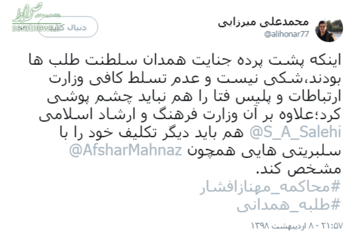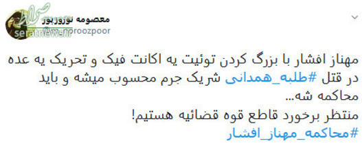 خبر قتل طلبه همدانی از دو روز پیش سروصدای زیادی در فضای مجازی به پا کرده است. کاربران با انتشار پستهایی در شبکههای اجتماعی، نظرات خود را درباره این حادثه به اشتراک میگذارند. برخی از آنها با کنار هم گذاشتن رویدادهای چند روز اخیر، برخی سلبریتیها از جمله مهناز افشار را در این حادثه بیتقصیر نمیدانند و معتقدند او با اظهارنظرهای غیرکارشناسی و بهخصوص در این مورد با بازنشر یک پست جعلی باعث تحریک کاربران شده است.