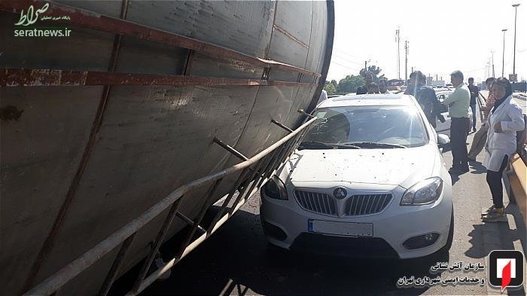 خوشبختانه این تانکر حجیم مستقیما بر روی خودروهای در حال عبور سقوط نکرده بود و پس از وارد آوردن خسارت به دو خودروی برلیانس و پراید متوقف شده و ترافیک زیادی را در سطح بزرگراه ایجاد کرده بود.
