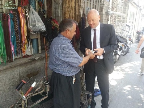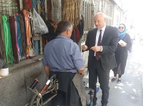 سفیر آلمان با انتشار تصاویری نوشت: «استفاده از راهنمایى حرفه اى براى تهیه بندکفش هاى موردنیاز: توقف کوتاهى امروز در راه برگشت از یک جلسه در خیابان شهید شاهچراغى در مرکز شهر تهران»