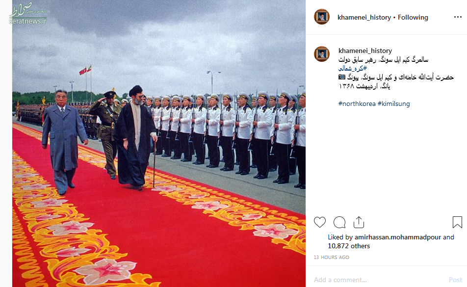 صفحه اینستاگرامی " تاریخ ایران و جهان" از صفحات منتسب به دفتر حفظ و نشر آثار حضرت آیتاللّه خامنهای، در سالمرگ کیم ایل سونگ ( رهبر سابق دولت کره شمالی) تصویری از حضور رهبر انقلاب در پیونگیانگ، پایتخت کره شمالی، در جریان سفر ایشان به این کشور در اردیبهشت سال ۶۸ را بازنشر کرد. در ادامه تصویر منتشرشده در صفحه اینستاگرامی " تاریخ ایران و جهان" را مشاهده میکنید.