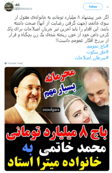 براساس اخبار منتشرشده در فضای مجازی سران اصلاحات با هدایت محمد خاتمی دور جدیدی از تلاش خود برای به دست آوردن رضایت از خانواده میترا استاد را شروع کردند. نزدیکان رئیس دولت اصلاحات که در گام نخست با فشار روی خانواده مقتول، نتوانستند رضایت بگیرند هماکنون با فعال کردن استاندار کرمانشاه در دوره اصلاحات، در جهت تطمیع این خانواده برآمدهاند.
