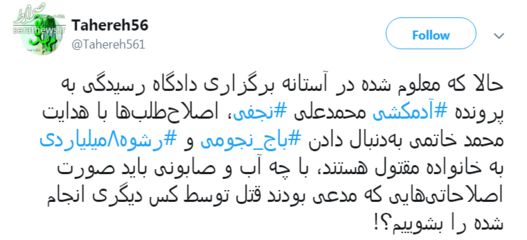 پیشتر نیز برخی منابع آگاه از تلاش افراد نزدیک به نجفی برای گرفتن رضایت از خانواده مرحومه میترا استاد خبر داده بودند، اما این بار گویا اصلاح طلبان برای رسیدن به این مقصود برای رهایی نجفی پیشقدم شدند.