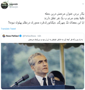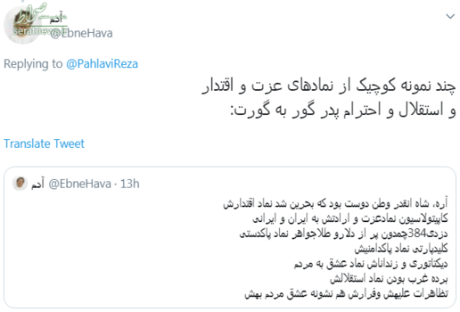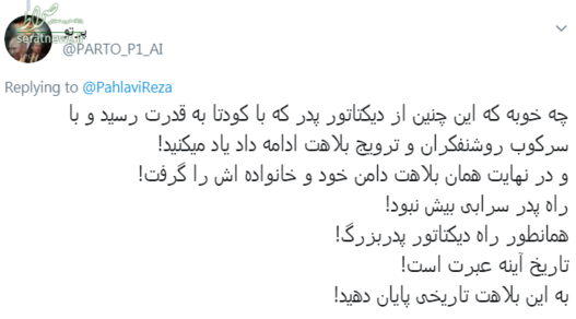 به گزارش باشگاه خبرنگاران فرزند شاه مخلوع ایران نوشته است: «به یاد پدرم که هر آنچه کرد به خاطر عشقش به ایران بود و سربلندی مردمش». همین جمله واکنش تند و صریح کاربران فضای مجازی را به دنبال داشت. کاربران با بازخوانی جنایتهای پهلوی اول و دوم به دیکتاتورمآبی آنها اشاره کردند و ضمن انتقاد از ربع پهلوی بابت اشتراک گذاشتن این پست از او خواستند تا به تاریخ رجوع کند.