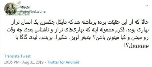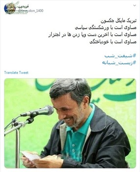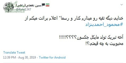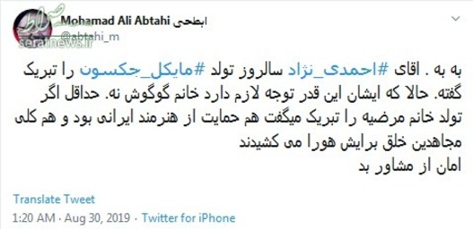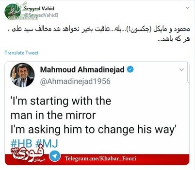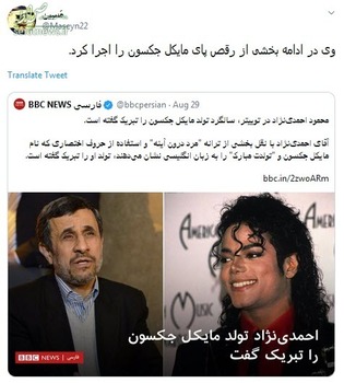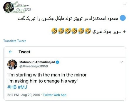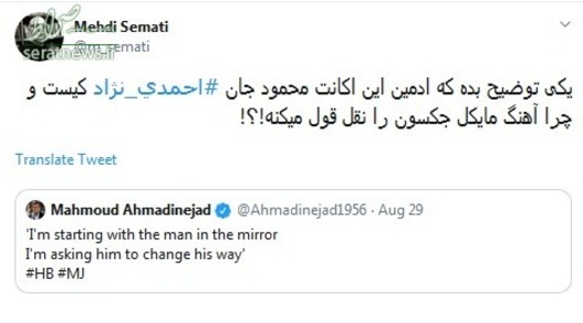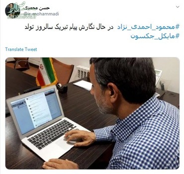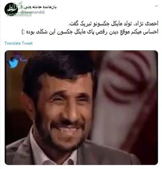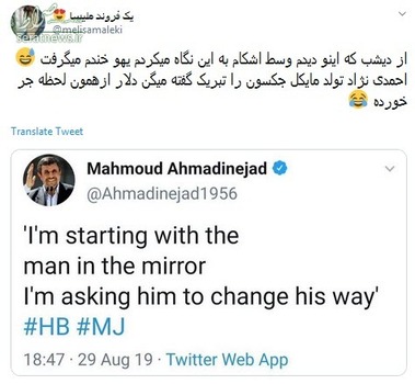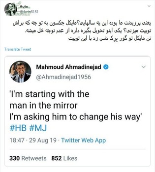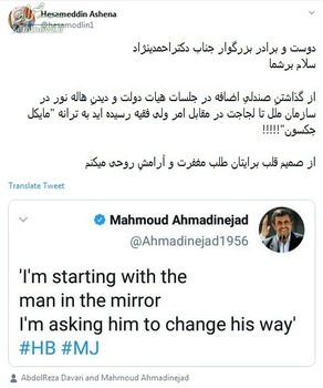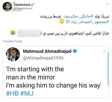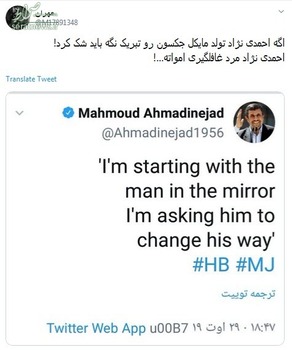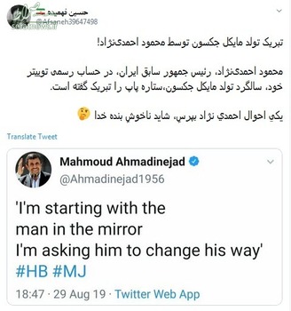 به گزارش باشگاه خبرنگاران اما احمدینژاد در جدیدترین پست توییتری خود به زبان انگلیسی در اقدامی نامتعارف تولد مایکل جکسون خواننده پرحاشیه آمریکایی را تبریک گفت که با حواشی زیادی همراه شد. محمود احمدینژاد در پیامی توئیتری با آوردن ترانه «من از مرد درون آینه شروع میکنم، از او میخواهم که خود را دگرگون کند»، و استفاده از برچسب انگلیسی و حروف اختصاری نام مایکل جکسون (MJ) و تولدت مبارک (HB)، زادروز این خواننده پاپ را تبریک گفت. گفتنی است موزیک ویدئوی این آهنگ حاوی مطالب توهینآمیز به جمهوری اسلامی ایران و امام خمینی (ره) است.