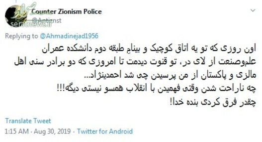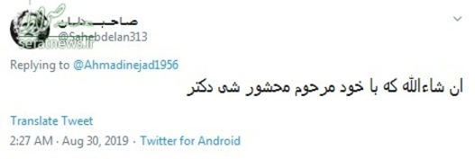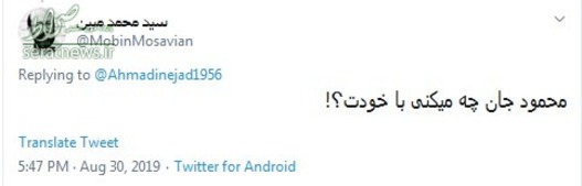 اگر به حساب کاربری توییتر محمود احمدینژاد سر بزنید، میبینید او مدتهاست که دیگر به فارسی پستی ننوشته است و همه پستهایش به زبان انگلیسی است. این در حالی است که موضوع پستهای منتشر شده در این صفحه، عجیبتر از زبان آنهاست. در محتوای این پستها از تبریک قهرمانی تیم رپتورز در لیگ انبیای تا قهرمانی تیم ردساکس در لیگ بیسبال آمریکا یا تبریک به تیم قهرمان هاکی روی یخ لیگ حرفهای آمریکا! قابل مشاهده است.