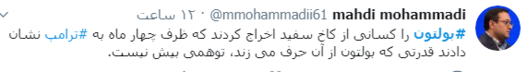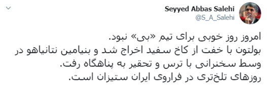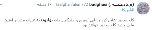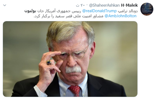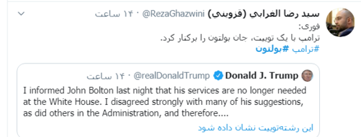 در ادامه بخشی از واکنشهای کاربران فضای مجازی به اخراج جان بولتون از کاخ سفید توسط دونالد ترامپ را مشاهده میکنید.