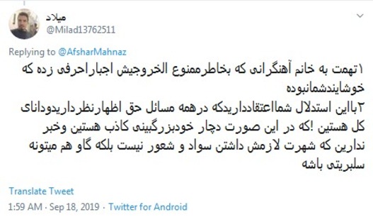 این بار هم واکنش عجولانه و عجیب این هنرپیشه سینما به سخنان آهنگرانی مورد انتقاد تند کاربران فضای مجازی قرار گرفت. در ادامه نمونههایی از اظهارنظرهای غیرمتخصصانه و حاشیهساز مهناز افشار را مشاهده میکنید: