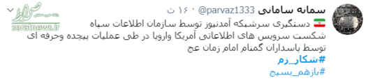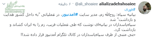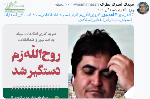 به گزیارش باشگاه خبرنگاران ساعتی قبل روابط عمومی کل سپاه پاسداران انقلاب اسلامی در اطلاعیهای با اعلام خبر عملیات دستگیری روح اللّه زم، سرشبکه سایت ضد انقلاب موسوم به آمدنیوز طی عملیات پیچیده و حرفهای سازمان اطلاعات سپاه، بر شکست و جا ماندن سرویسهای اطلاعاتی دشمن از قدرت اطلاعاتی سپاه تأکید کرد.