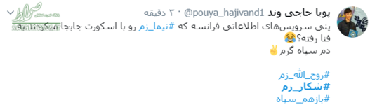 همزمان با انتشار خبر دستگیری سرشبکه کانال معاند آمدنیوز توسط سربازان گمنام امام زمان(عج)، کاربران فضای مجازی با داغ کردن هشتگ #شکار_زم نسبت به دستگیری زم واکنش نشان دادند.