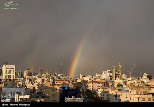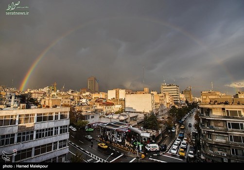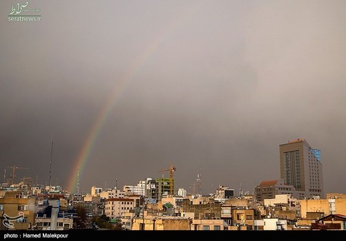 ساعتی پیش بر اثر بارش شدید باران و تابش همزمان آقتاب از سمت غرب رنگین کمانی زیبا و دیدنی در آسمان تهران پدیدار شد.