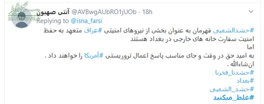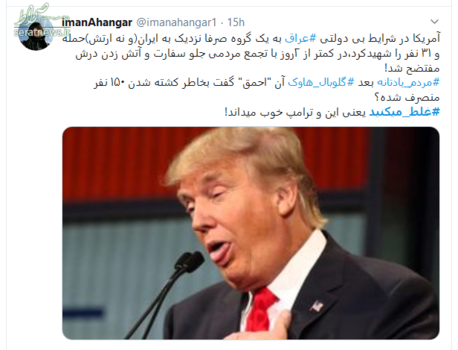 پس از آنکه آمریکا با حمله موشکی به مواضع حشد الشعبی، تعداد زیادی از جوانان مبارز عراقی را شهید و مجروح کرد، مردم عراق در جواب کشتارهای آمریکا، به سفارت این کشور در عراق حمله‌ و آن را تصاحب کردند. شعارهای ضد آمریکایی مردم و همچنین آتش زدن پرچم آمریکا در سفارت این کشور، موجب خشم ترامپ، رئیس جمهور این کشور شد و او در پیامی توئیتری، اعلام کرد که ایران را مسئول این اتفاقات می‌داند.