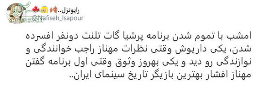 به گزارش برترین ها حضور مهناز افشار البته نکته جالب توجهی بود که بعد از یک سال پرحاشیه بالاخره در جایی غیر از شبکههای اجتماعی حضور حرفهای داشت و البته باز هم یک حاشیه کوچک داشت. جایی از برنامه یکی از شرکت کنندهها آرزو کرد که در برنامه بعدی بتواند برای پدر و مادرش هم ویزا بگیرد تا کار او را از نزدیک تماشا کنند، مهناز افشار هم در پاسخ آن شرکتکننده از حضار و بینندگان خواست که دعا کنند تا بتواند برای مادرش ویزا بگیرد.