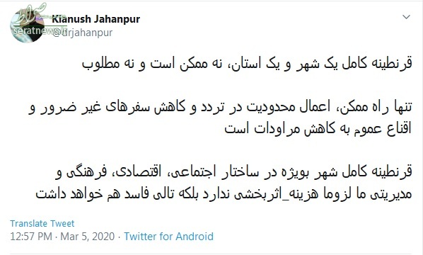 سخنگوی وزارت بهداشت با انتشار پستی در صفحه توئیتری خود قرنطینه کامل یک شهر را نامطلوب و ناممکن دانست.