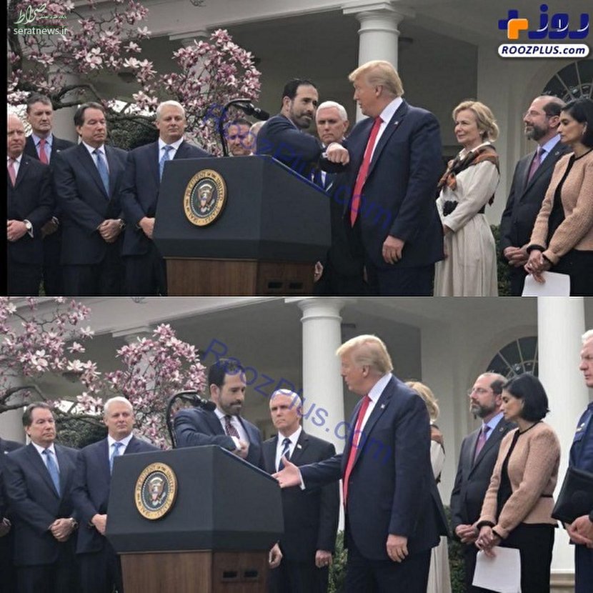 ترامپ خواست با یکی از شرکتکنندگان در کنفرانس خبری امروز دست بدهد، اما این فرد از دست دادن با ترامپ خودداری کرد و آرنجش را به آرنج ترامپ زد.