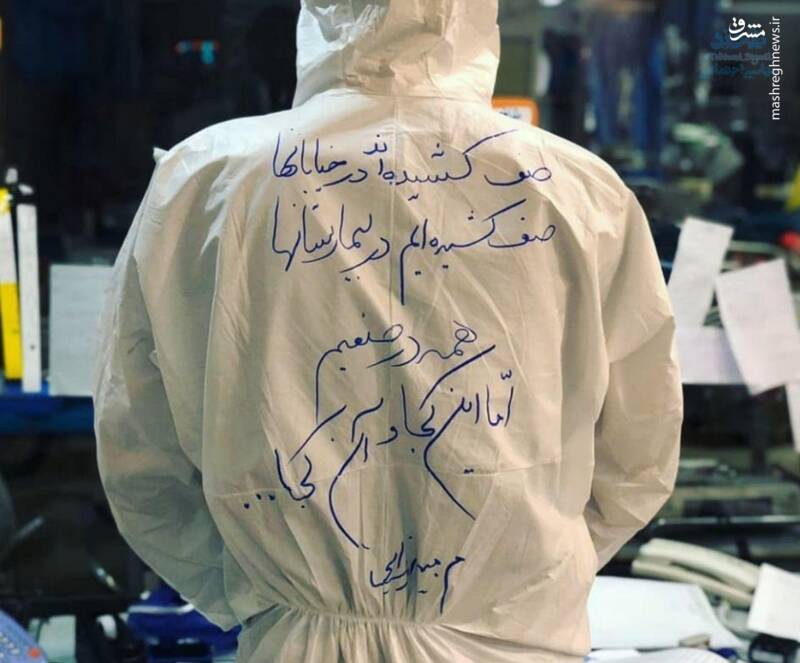 نوشته قابل تامل روی لباس قرنطینه پرستار بیمارستان مسیح دانشوری: صف کشیدهاند در خیابانها صف کشیدهایم در بیمارستانها همه در صفیم اما این کجا و آن کجا...