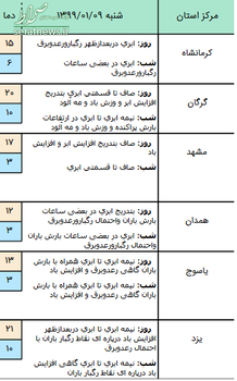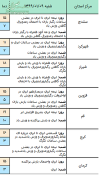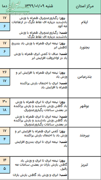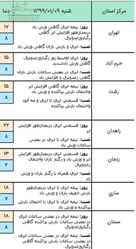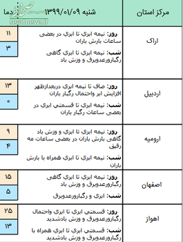 بر اساس تحلیل آخرین نقشههای هواشناسی در روز شنبه در استانهای واقع در شمالغرب، غرب، جنوبغرب، استانهای واقع در دامنههای شمالی و جنوبی البرز مرکزی و بخشهایی از مرکز و جنوبشرق کشور بارش باران، گاهی رعد و برق و وزش باد شدید موقت و در مناطق مستعد بارش تگرگ پیشبینی میشود.