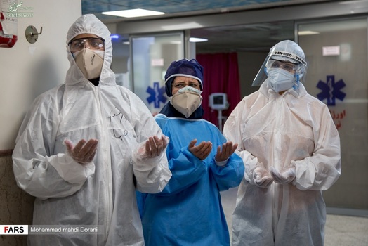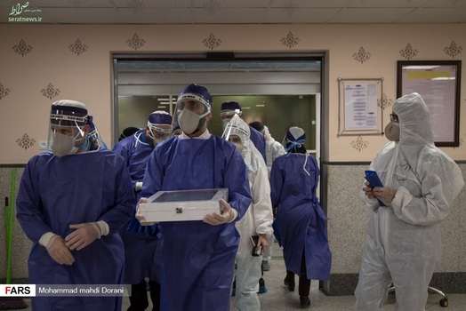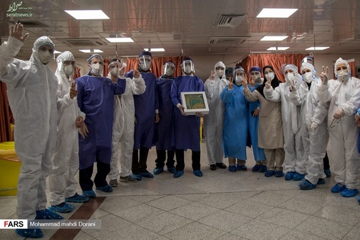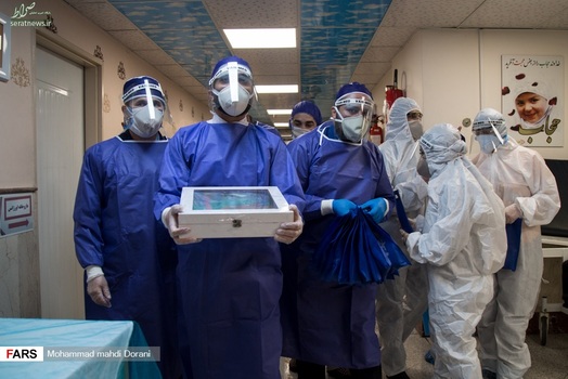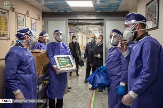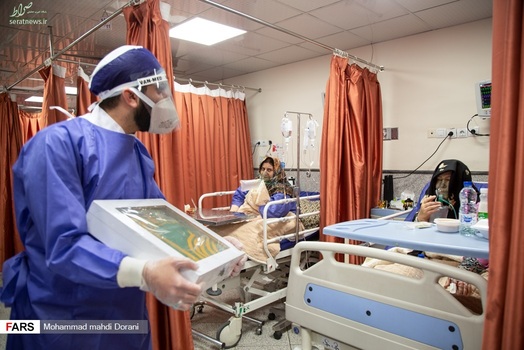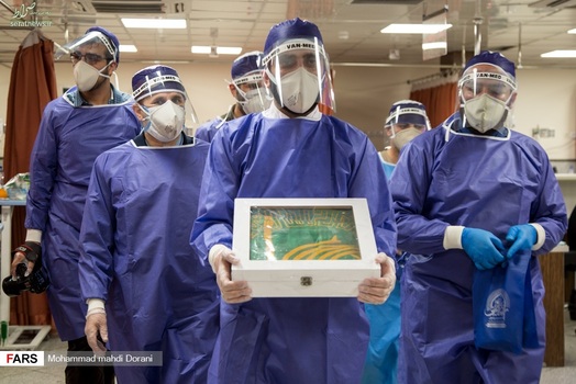 خادمان حرم امام رضا (ع) روز شنبه ۹ فروردین ۱۳۹۹ به همراه پرچم متبرک حرم با حضور در بخش کرونای بیمارستان بعثت تهران، از بیماران بستری در این بخش عیادت کردند.