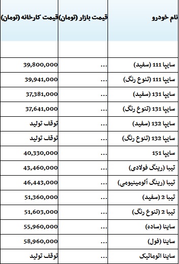 قیمت روز محصولات سایپا در کارخانه به شرح زیر است.