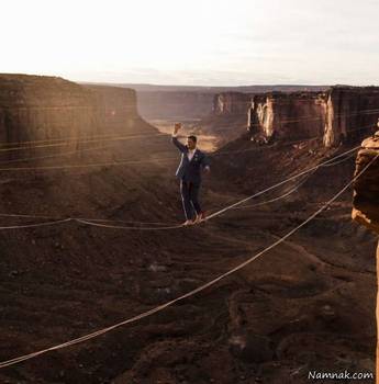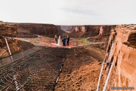 زوج امریکایی مراسم ازدواجشان را در ارتفاع 122 متری از کوههای «گرند کانیون » ایالت یوتا آمریکا برگزار کردند. "ریان جنکز" و کیمبرلی وجلین" در ارتفاعات ترسناک 122 متری در حالیکه روی سطح توری ایستاده بودند پیمان ازدواج بستند. همانطور که در تصاویر مشاهده میکنید عروس و داماد و برگزار کننده مراسم به همساه ساقدوش ها روی یک سطح توری که به بخش هایی از صخره ها متصل شده بود ایستاده اند و به هیچ کدام از میهمانان جرات نزدیک شده با آنها را ندارند چرا که مسیر معلق و سطح ترسناک مانع از آمدن آنها به کنار عروس و داماد شده.