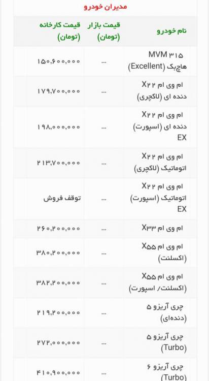 قیمت روز محصولات مدیرانخودرو در کارخانه به شرح زیر است.