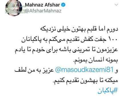 مهناز افشار با تاخیر نسبت به ماجرای سحرقریشی واکنش نشان داده و ۱۰۰جفت کفش اهدا کرده به پاکبانان، این پروژه با کمک مسعود کاظمی(روزنامهنگار) انجام شده. اما خب قضیه حاشیه داشته، برخی گفتهاند این یک تسویه حساب شخصی با سحر قریشی است و برخی هم چنین رفتارهایی را ریاکارانه دانستهاند، افشار اما چند ساعت بعد به واکنشها، واکنش نشان داد.
