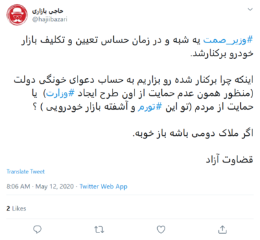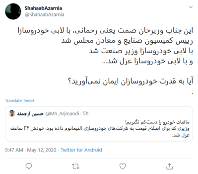 برخی کاربران این اقدام را در پی اولتیماتوم رحمانی به خودروسازان برای تعدیل قیمتهای نجومی بازار معرفی کرده و این را حاصل نفوذ مافیای صنعت خودروی کشور دانستند. تعدادی از کاربران نیز انتصاب رحمانی به سمت وزیر صمت را از ابتدا اشتباه عنوان و از عملکردش در دوران وزارت انتقاد کردند.