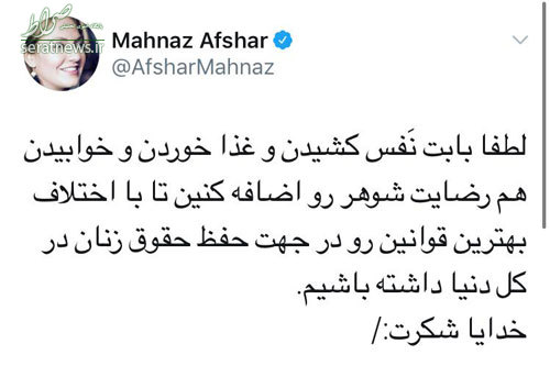 مهناز افشار در حساب کاربری خود در توئیتر تلویحا از قانون الزام رضایت شوهر برای زنان متاهلِ متقاضی شرکت در آزمون پذیرش دستیار در رشتههای تخصصی دندانپزشکی انتقاد کرد.