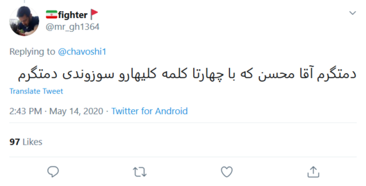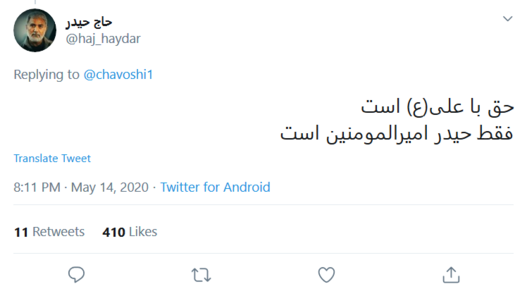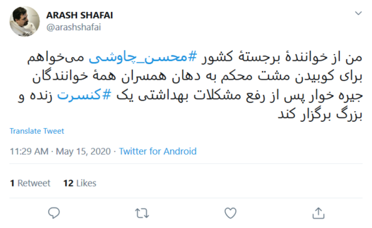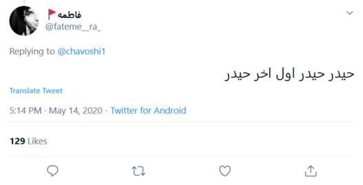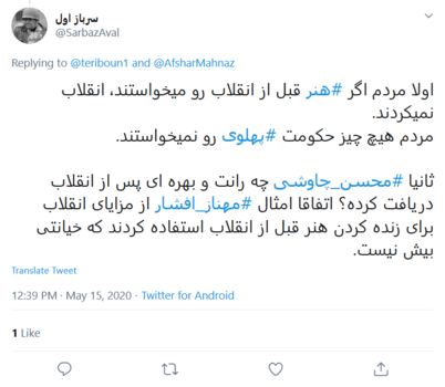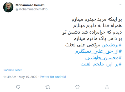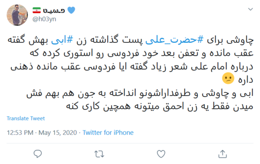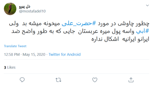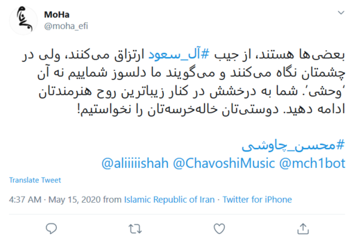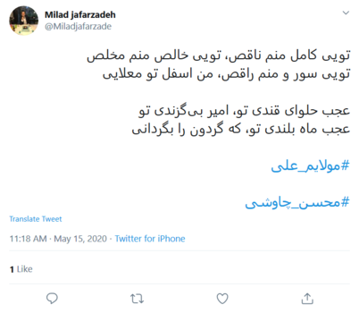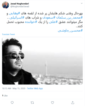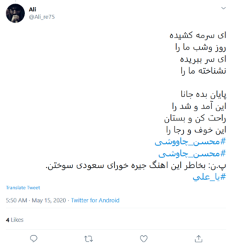 «دیدن این بیت بر صفحه یک آرتیست نفس را در سینه حبس میکند... «با یدالله و با_تیغ علی ذوالفقار _سینه گردنکشان _اذن دهد میدرم»... از مجموعه کلمات این بیت بوی تعفن عقب ماندگی و وحشیگری میبارد». این در حالی است که همسر او (ابی) و چند خواننده لسآنجلسی دیگر، مدتی پیش در عربستان کنسرت اجرا کردند؛ کشوری که دستان دولتمردانش به خون هزاران زن و کودک بیگناه یمنی و بحرینی و سوری آلوده است.