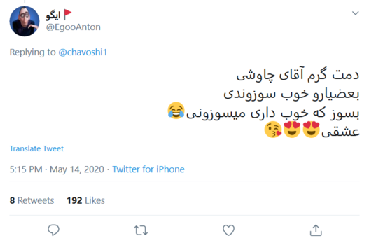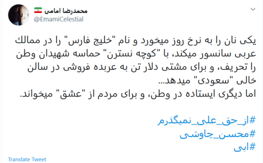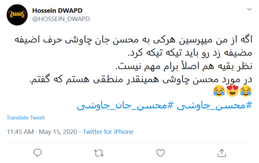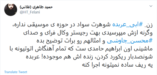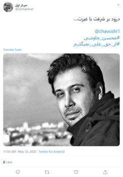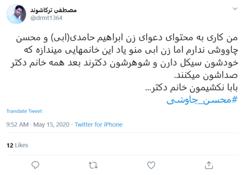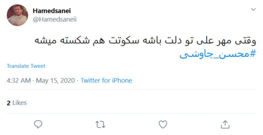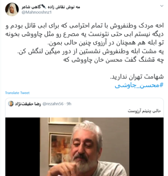 پس از انتشار این پست، مهشید برومند، همسر ابراهیم حامدی، خواننده ایرانی خارجنشین که با نام هنری «ابی» به فعالیت در این عرصه میپردازد، در اینستاگرام خود به بیت درج شده در پست چاووشی اهانت کرد و او را عربپرست خواند. او با گرفتن ژست میهنپرستی، به برخی اتفاقات اخیر همچون سقوط هواپیمای اوکراینی اشاره کرد و در انتهای متن طولانی خود اینطور به محسن چاووشی حمله کرد: