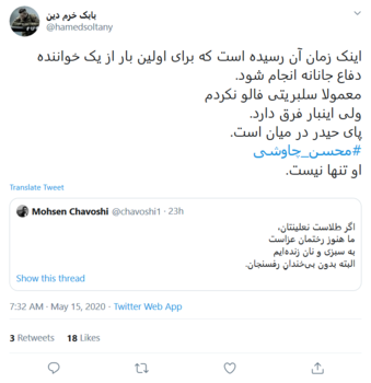 حالا نوبت به کاربران فضای مجازی رسیده بود تا پس از این جدال، هشتگ #محسن_چاووشی را داغ کنند و اهانتهای همسر این خواننده لسآنجلسی به امیرالمؤمنین علی (ع) را، آن هم در شبهای قدر و همزمان با روزهای عزاداری برای اولین امام شیعیان، بیپاسخ نگذارند. برخی از کاربران سفر اخیر تعدادی از خوانندگان خارجنشین به عربستان و اجرای کنسرت برای بنسلمان را یادآوری و عنوان کردند که اگر این خوانندگان حامی حقوق مردم ایران بودند اقدام به برگزاری کنسرت در عربستان سعودی نمیکردند.