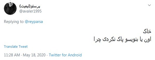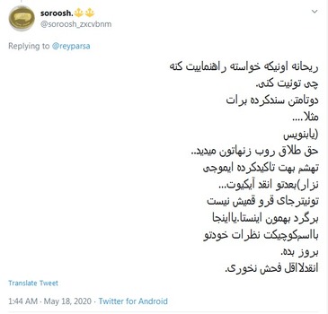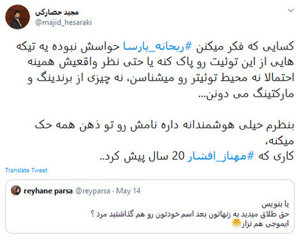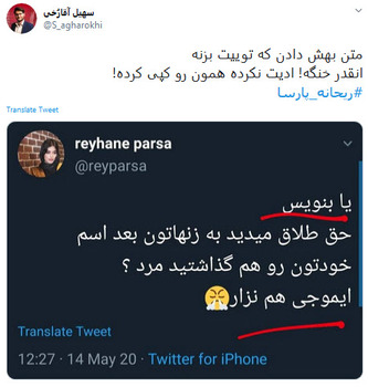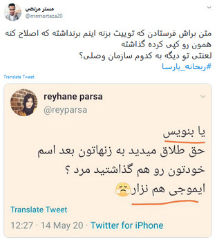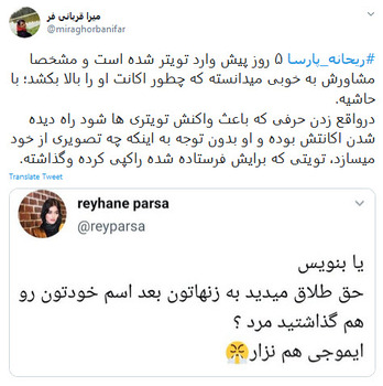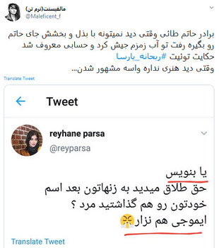 او در ادامه و در تأیید حرف خود پستی را در صفحه توئیترش به اشتراک گذاشت و نوشت: «یا بنویس حق طلاق میدید به زنهاتون بعد اسم خودتون رو هم گذاشتید مرد؟ ایموجی هم نزار».