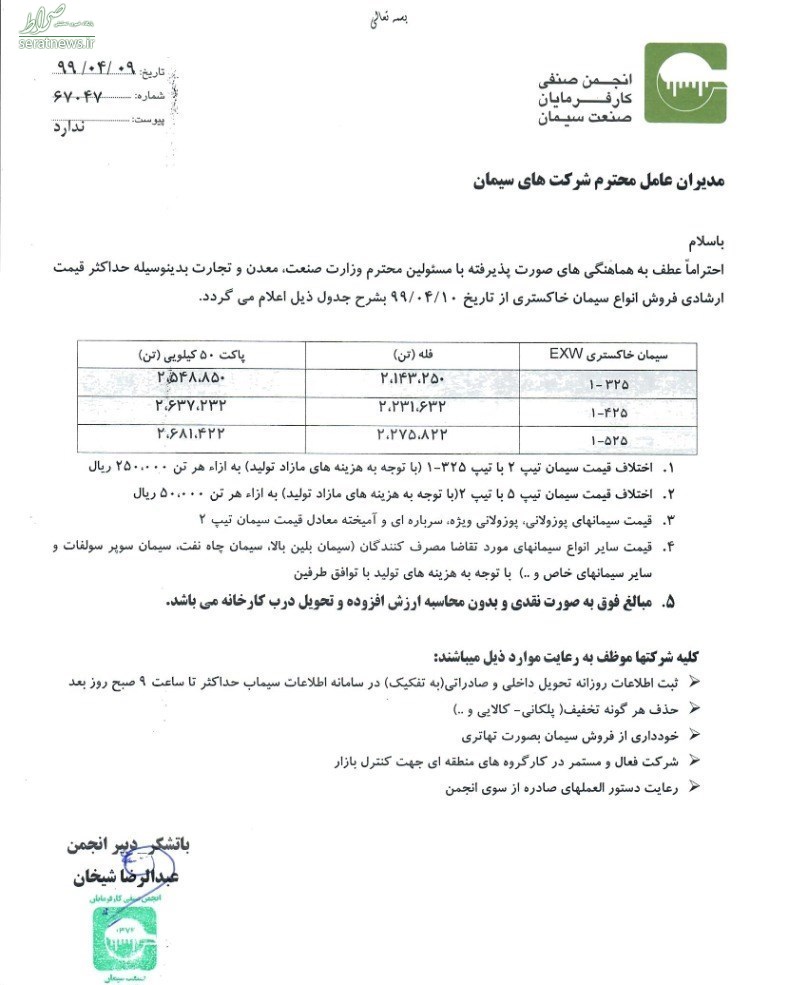 بر اساس توافقات به عمل آمده با وزارت صنعت قیمت سیمان ۲۰ تا ۳۰ درصد افزایش پیدا کرد. بر همین اساس قیمتهای جدید انواع سیمان خاکستری از تاریخ ۱۰ تیرماه اچرایی خواهد شد.